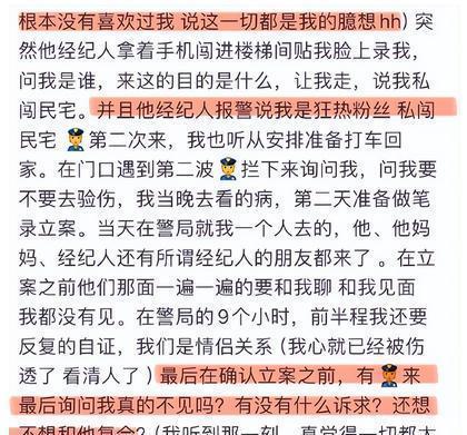 两边缠了挺长时间,最后因为荣梓杉把她打了一顿,然后报警了,经纪人还一直在说“李禹熹只是粉丝,还患有妄想症,还擅自闯了民宅”。总的来说,双方各说各话,因为都没有拿出确凿的证据,这事儿到现在还是个罗生门。